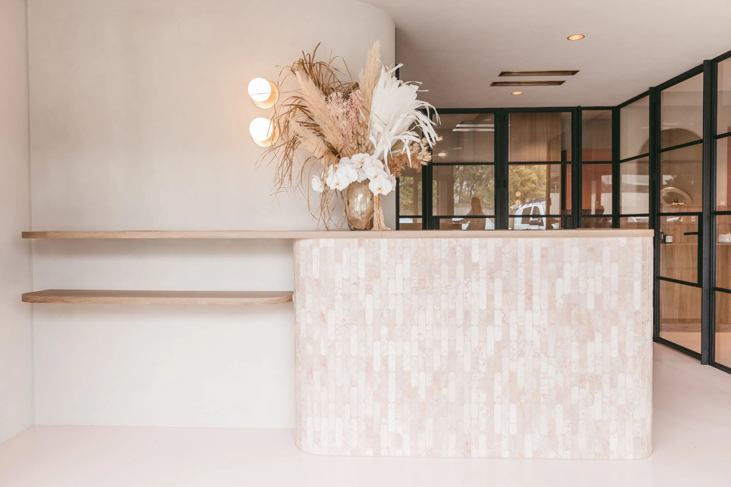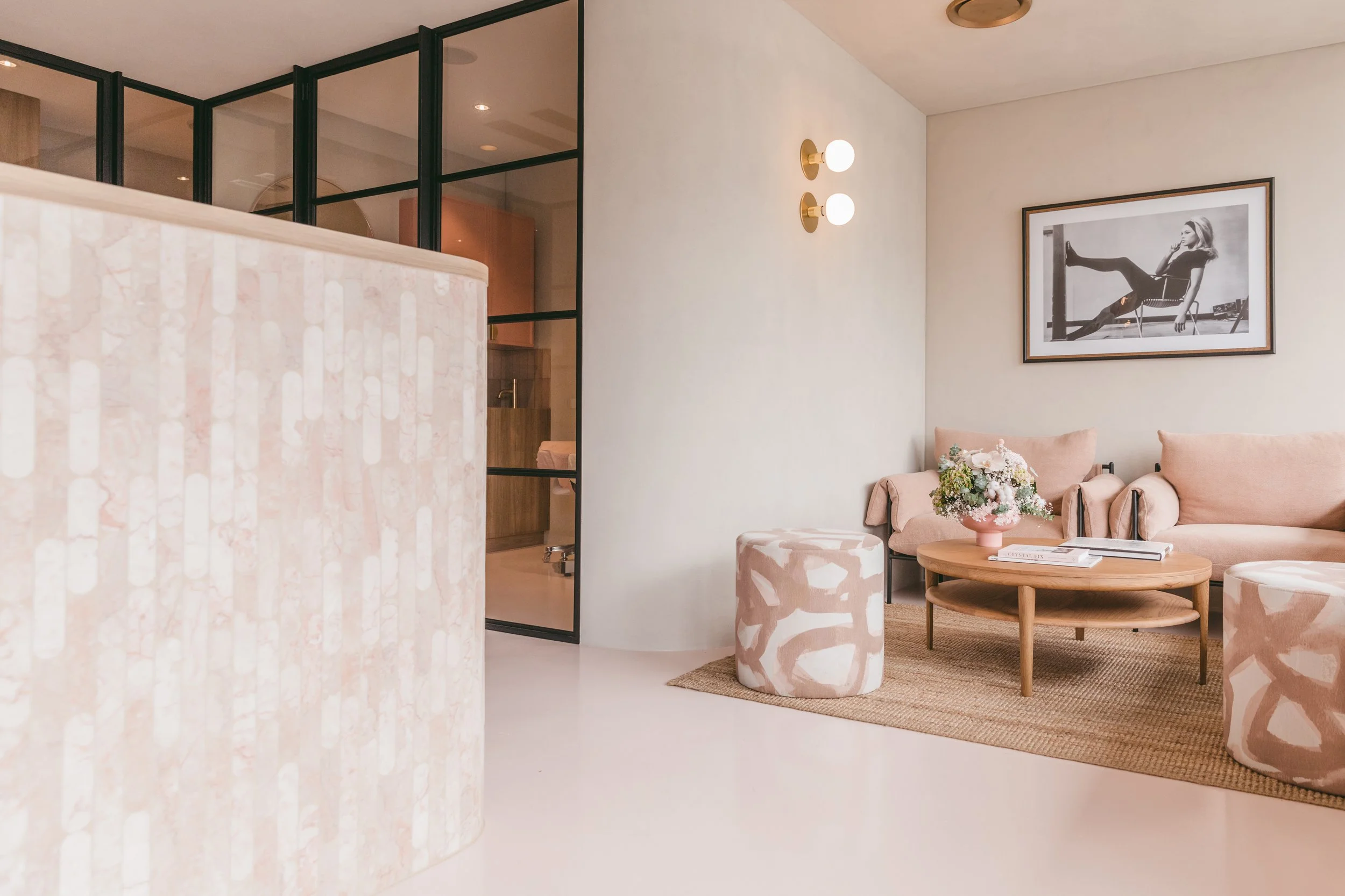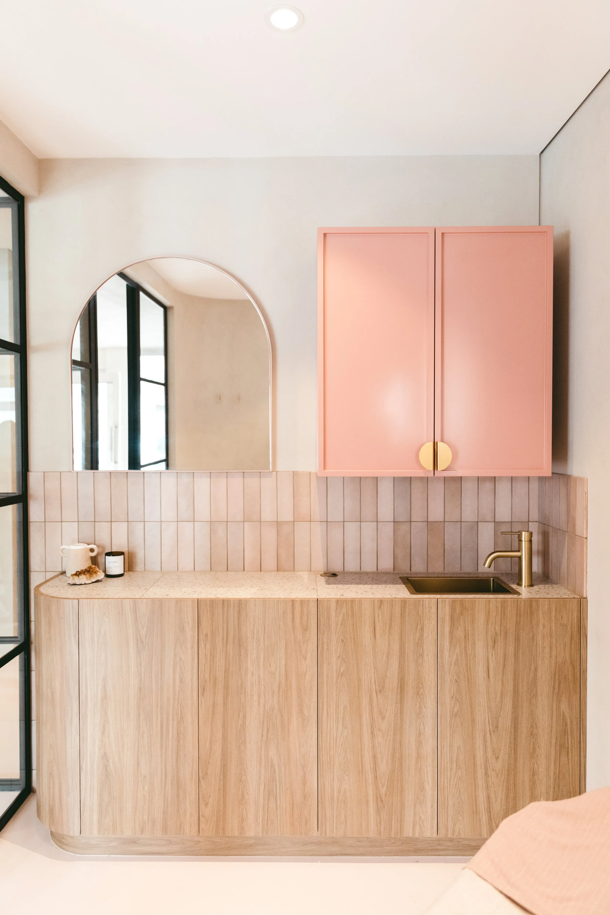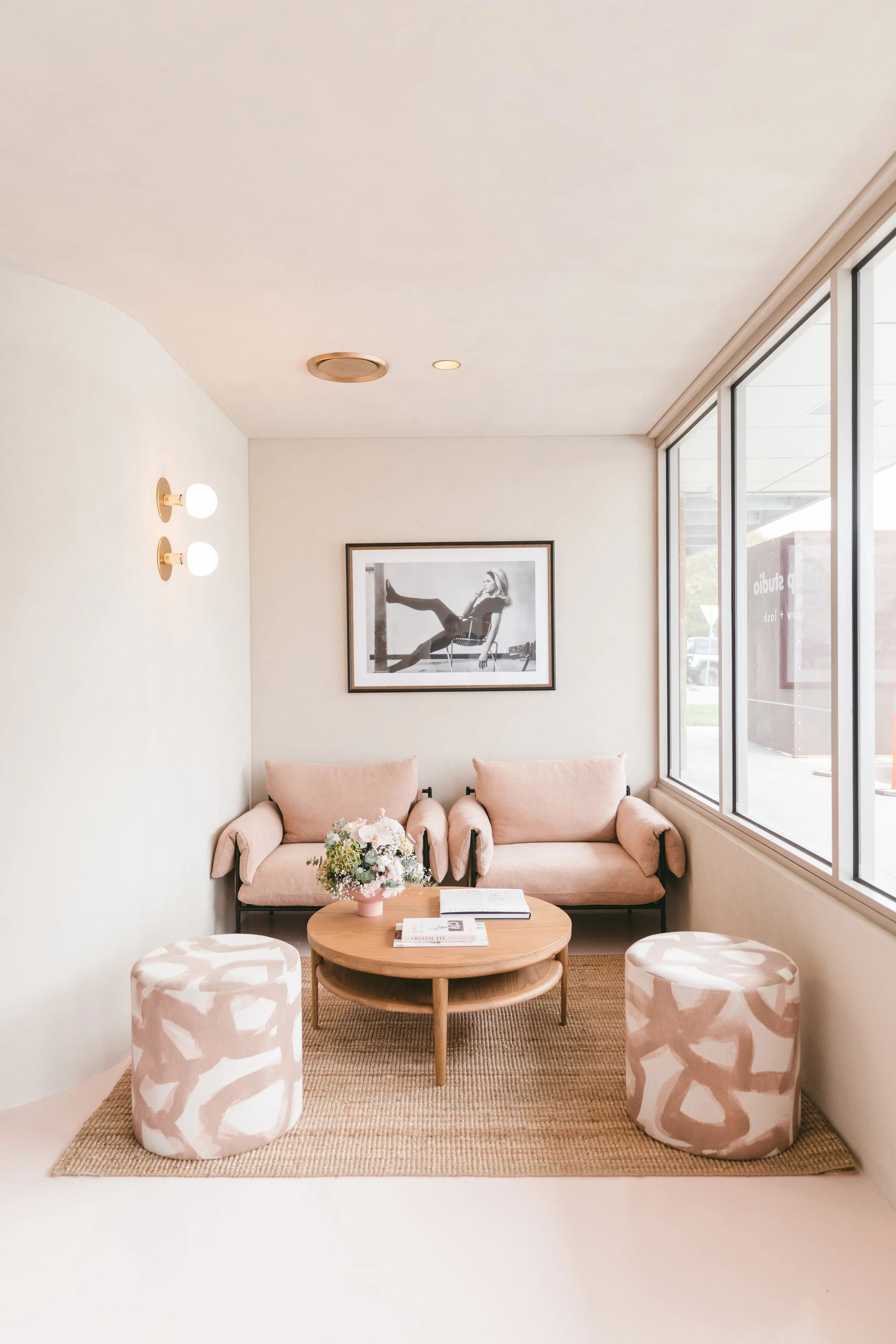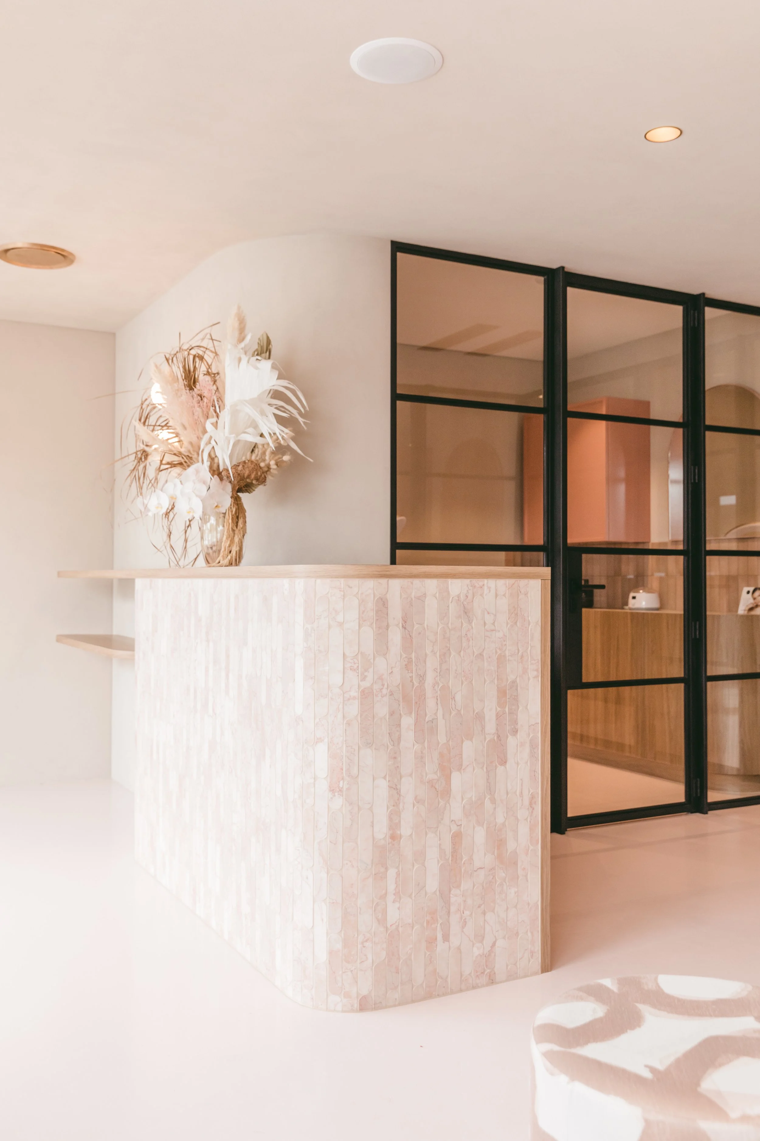 Soft tones, layered textures and contrasting materials make the Peep Studio space a considered retreat for brow and lash pampering. Inspired by the studio's peachy pink branding and their main game of lash and brow sculpting, there is an emphasis on soft warm colours and curved forms.