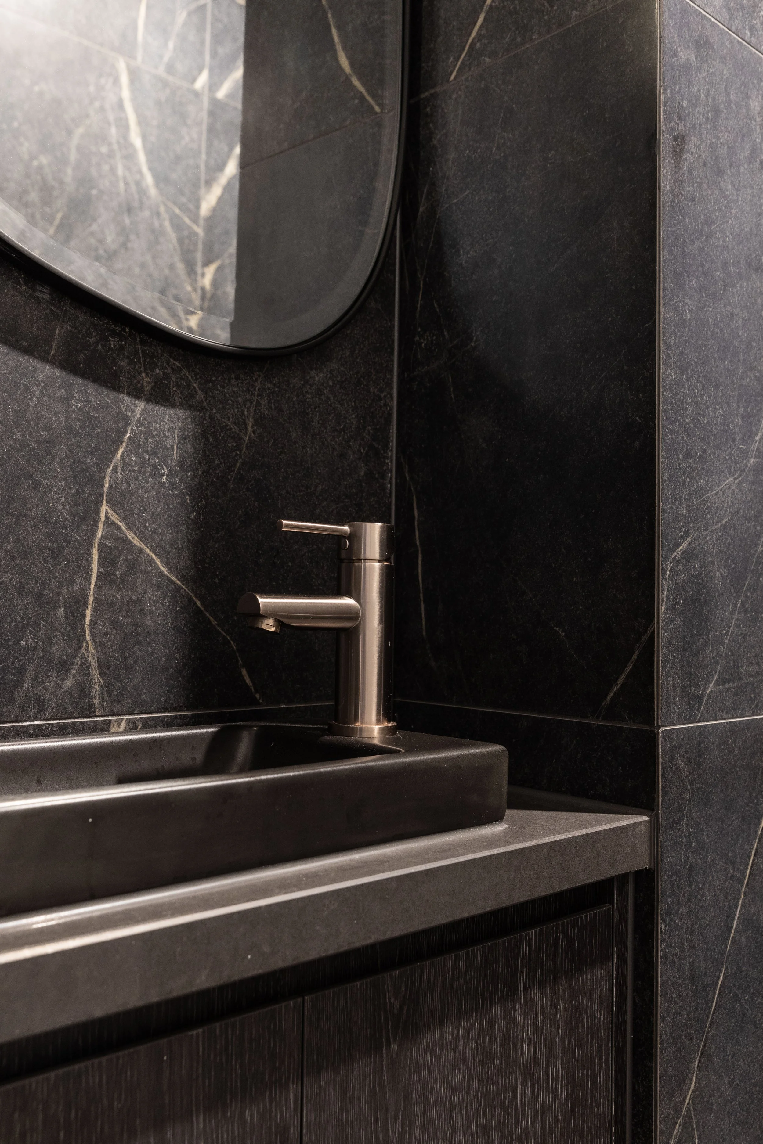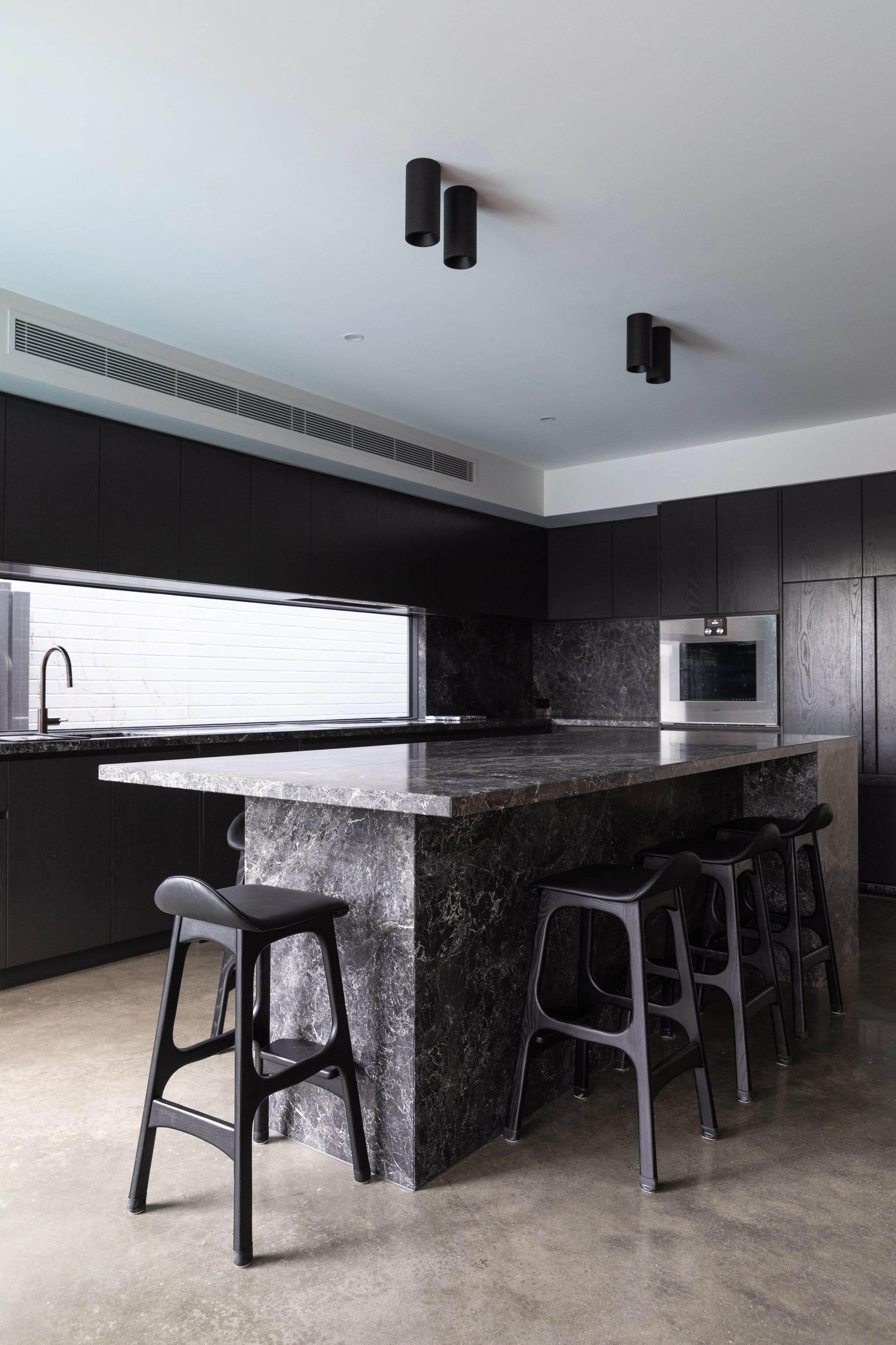 Inky stained oak, striking veined marble, soft grey concrete and hints of champagne metals create a stunning and timeless aesthetic, reflecting the clients minimalist brief.